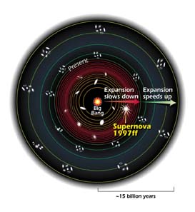 According to the standard view of cosmology, the once infinitesimal universe has ballooned in volume ever since its fiery birth in the Big Bang, but the mutual gravitational tug of all the matter in the cosmos has gradually slowed that expansion.