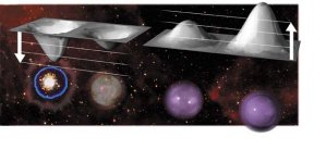 According to Einstein’s theory, pressure has another mind-bending property: It can be negative. An object having negative pressure resists being stretched. “Think of negative pressure as silly putty or a rubber sheet. The atoms don’t want to be drawn apart; there’s a force that pulls them together,” says Turner. Negative pressure, he notes, would impart a springiness or elasticity to space.