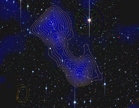 Contour lines outline an invisible dark matter filament connecting the galaxy clusters Abell 222 (bottom) and Abell 223 (top) in the night sky. The cosmic thread revealed itself by distorting light coming from distant galaxies.
