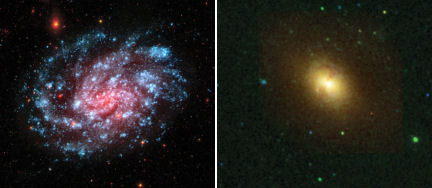 But in 2003, Dekel and others became intrigued by a finding about galaxies that dark matter alone could not explain. Astronomers have known since the 1920s that the modern-day universe consists mainly of two galaxy types—young-looking, disk-shaped spirals like the Milky Way, and elderly, football-shaped ellipticals. Ellipticals have a reddish tinge—an indication that they are old and finished forming stars long ago—while spirals have a bluish tinge, a sign of recent star formation.