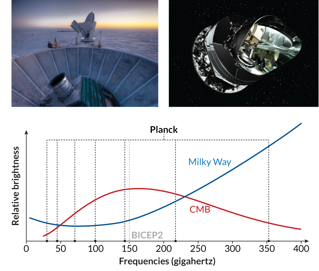 BICEP researchers knew their telescope could not tell the difference between sources of light. Confidence in their claim came from the painstaking work they had done to minimize the influence of dust. They pointed BICEP2 toward a part of the sky known to have very little dust. And they probed for light at a frequency, 150 gigahertz, at which the CMB should stand out above the Milky Way’s dusty glare. The CMB puts out most of its energy at about 160 gigahertz; dust radiates predominantly at around 3,000 gigahertz.
