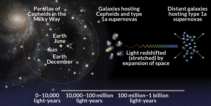 To create their distance ladder, Riess and colleagues combined geometrical distance measurements with “standard candles” — objects of known brightness. Since a candle that’s farther away is dimmer, if you know its absolute brightness, you can calculate its distance. For standard candles, the team used Cepheid variable stars, which pulsate at a rate that is correlated with their brightness, and type 1a supernovas, whose brightness properties are well-understood.