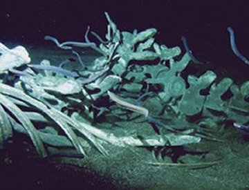 When the hordes of little creatures have nibbled the whale fall down to bones, a third successional stage begins. The bacterial mats remain, and life around the whale takes on its strongest resemblance to that at a deep-ocean vent. This stage has so far been observed only in the natural whale falls.