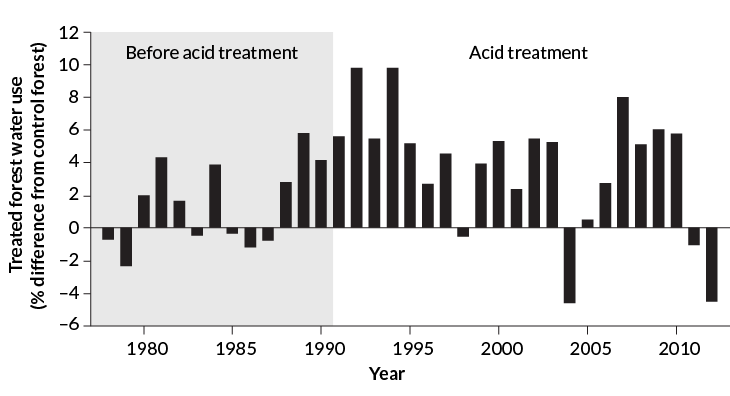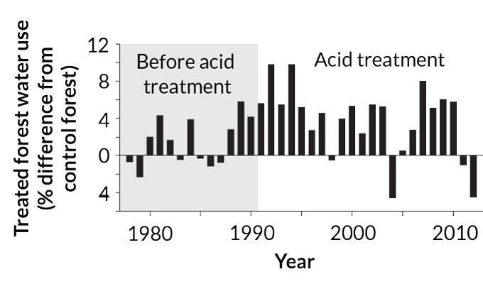 A forest receiving a mock acid rain treatment tended to use more water than a similar untreated forest during an experiment that ran from 1989 to 2012. The first two years’ of data after acidification were not included with the treatment period because the soil may not have been fully acidified. And researchers discounted data from 2004 because plant growth in the control forest was unusually high that year, likely changing its water use in a way not mirrored in the treated area.