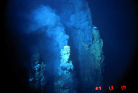 Microbes feeding off hydrothermal vents at the bottom of the Pacific Ocean transform the chimneylike structures (shown here) they inhabit into natural batteries.