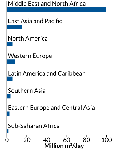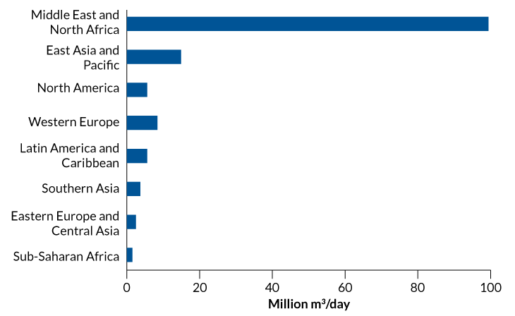 Using data on the water sources and technology used at desalination facilities around the globe, Qadir and his colleagues estimated for the first time how much brine is discharged daily. For every liter of pure water made, they found that on average 1.5 liters of highly concentrated brine is released back into the environment. Per day, that value translates to more than half the daily volume of water pouring over Niagara Falls, with 70 percent of it originating from desalination plants in arid North Africa and the Middle East.