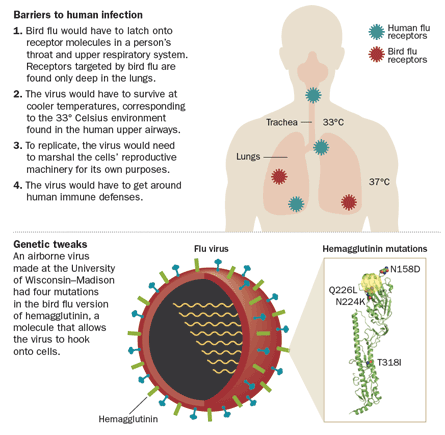 Many more changes would be required to achieve a version of H5N1 that could transmit easily between people, the CDC and Scripps team speculated. But the researchers may have been closer than they thought. This paper was not reviewed by the biosecurity advisory board.