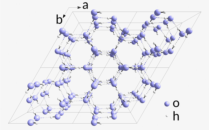 COMPACT CUBE Researchers discovered ice-VII entombed within a diamond. Found only in very high pressure environments, such as those deep in Earth's interior, ice-VII's compact form consists of cubic lattices of hydrogen atoms (in red) and oxygen atoms (in blue). As the pressure changes, the orientation of the hydrogen atoms can shift; this diagram shows several possible hydrogen arrangements for each molecule.
