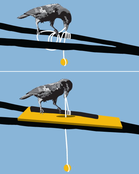 Gray and Taylor set up a platform instead of a perch, which limited what the crows could see while pulling the string. The birds could investigate the string and the dangling meat from the sides but had to hop onto the platform and pull the string up through a slot. The supposedly insightful toolmakers had a terrible time. Out of four birds that had never confronted a dangling tidbit, only one hauled in the treat, and that was on the fifth try. Another bird failed at 10 opportunities, pulling at the string 188 times but never stepping on it.