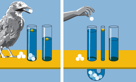 Researchers have done a similar kind of tweaking using experiments based on Aesop’s fables. In one of the old tales, a thirsty crow finds a jug partly full of water but can’t reach down far enough for a drink. So the bird plops stones into the jug until the water level rises.