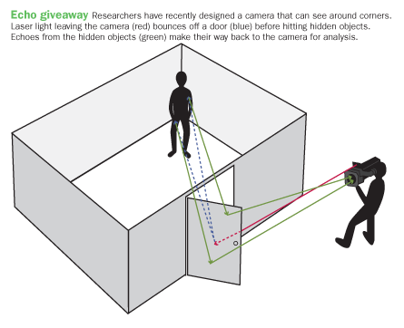 One new and interesting thing is the ability to look around corners, beyond the line of sight. Developed in 2009 by Raskar, MIT graduate student Ahmed Kirmani and colleagues at MIT and the University of California, Santa Cruz, a new camera with a titanium-sapphire laser for a flash shoots brilliant light in pulses lasting less than a trillionth of a second. After the light ricochets off objects, including those not visible to the photographer, the camera collects the returning “echoes.” The camera then analyzes the photons that return and can estimate shapes blocked by a wall or other obstruction.
