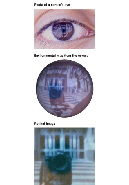 Another technology that might aid real-world sleuths is the “world in an eye” imaging system, which can re-create a person’s surroundings from information reflected in a single eye. Using a geometric model of the eye’s cornea, Nayar and colleague Ko Nishino, now at Drexel University in Philadelphia, created a camera that detects where the cornea and the white of the eye meet. Computations then turn the cornea’s reflection of a fish bowl–like image into a map of the environmental surroundings projected on the person’s retina.