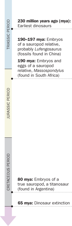 With all that’s known about adult dinosaurs, the discovery of at least 20 fossilized embryos of an early sauropod relative in southwestern China illustrates how little information there is regarding how the creatures developed in the egg. Paleontologists have found embryos and eggs of smaller relatives of the enormous, long-necked sauropods in South Africa (SN: 7/30/05, p. 68) dating to about 190 million years ago. Those embryos’ anatomy indicates hatchlings were probably awkward walkers and toothless, signs that the babies would have needed help from mom or dad. The next example of prehatchlings in the sauropod lineage doesn’t come until about 80 million years ago, with the appearance of embryos and eggs of a true sauropod group, the titanosaurs. Scientists think the huge size difference between adults and hatchlings, as well as the large number of eggs in each nest, means these giants didn’t provide much care for their young. How growth, reproduction and parental care evolved in sauropods and their cousins during the more than 100-million-year gap in the embryo fossil record is something of a mystery. The fossils must be somewhere, says Martin Sander of Germany’s University of Bonn, but “people just haven’t looked hard enough.”