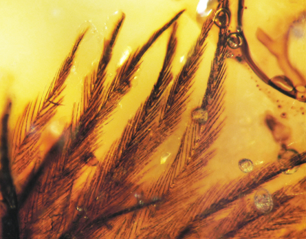 A separate striking amber specimen shows a birdlike feather branching into secondary twigs, or barbules, with hooklets like those in modern bird feathers that zip together side-by-side barbules to make a tight, interlocked surface. Barbules on another specimen spiral at the base, a feature that allows a feather’s linked elements to loosen a bit when wet. Such feathers on a modern waterbird ease diving by reducing trapped air, and they allow parents to soak their feathers in water and then ferry the drink back to chicks.