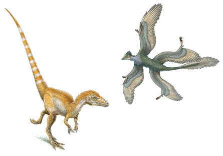 Simple filaments or clusters of filaments may have been early stages of feather evolution, unable to heave an animal off the ground but possibly of use for insulation or courtship displays. Fancier structures that weren’t flight-capable may have given an aerodynamic boost for animals rushing up steep slopes.