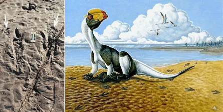 Now, Milner and his colleagues describe what they say is a clear set of theropod handprints, two inch-deep impressions preserved among hundreds of dinosaur footprints at the Utah site. The rocks also contain the fossils of fish, invertebrate burrows and the footprints of crabs, as well as evidence that the sediments had cracked and dried in the sun. Those are signs that the trackway, a fossilized trail of footprints made by a single animal, was made in the muddy sand of an ancient lakeshore about 198 million years ago, the researchers report March 4 in PLoS ONE. The now-hardened rocks preserve many details of the lakeside topography of that time, says Milner.
