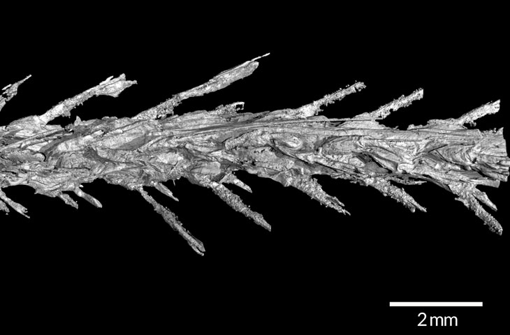 SHAKE YOUR TAIL FEATHER This feathered dinosaur tail is preserved in a 99-million-year-old lump of amber. Similarly stuck are several ants, a beetle and bits of foliage.