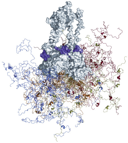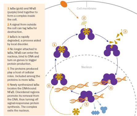 One of the proteins produced is more IκB±, which allows the response to be switched off again when it is no longer needed. IκB± binds to NFκB and strips it from the DNA, Dyson and Komives reported last year in IUBMB Life. It’s not yet clear how the stripping process works, but the disordered regions of IκB± appear to cast around like a fishing line to find NFκB and peel it off the DNA. The new complex of NFκB and IκB± leaves the nucleus and returns to its resting state within the cell. Thanks in part to the disordered regions, the cell can respond flexibly and rapidly to external stimuli.