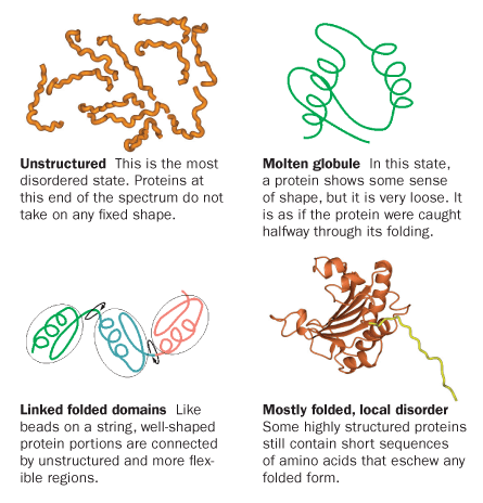 Still, IDPs, like any proteins, can misfold. And misfolded proteins known to play roles in some high-profile diseases have recently turned out to be disordered. The tau protein, for example, forms the characteristic protein tangles seen in Alzheimer’s disease. Same, it seems, for alpha-synuclein and Parkinson’s disease. Some scientists think disordered proteins may be more prone to misfolding than other types, but the relationship is not yet clear. By understanding the full range of protein folding behavior, scientists hope to gain insight into the causes of such diseases.
