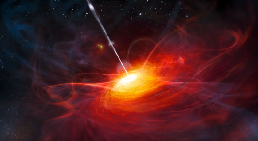 FAR, FAR AWAY A quasar lights up as interstellar debris swirls around a supermassive black hole in the center of a distant galaxy, as seen in this artist’s illustration.