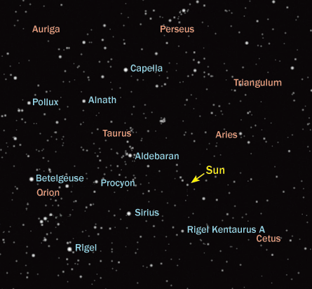 From Gliese 581g, you could see the Earth’s sun, about 20 light-years distant, and many of the stars (blue labels) and constellations (orange labels) visible from Earth. Credit: D. Nash, www.astronexus.com, adapted by T. Dubé