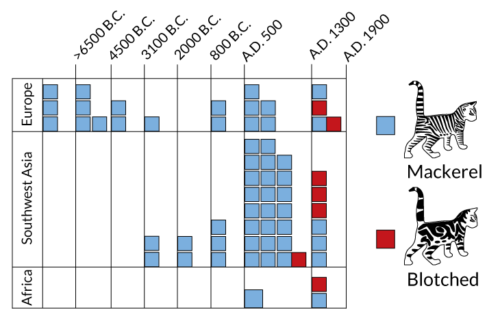 Wildcats and early domestic cats all looked the same with tiger-striped, mackerel coat patterns. New genetic data suggest the blotched tabby coat pattern that only domestic cats sport first popped up in Southwest Asia during the Middle Ages. (Boxes in chart represent ancient cats sampled in a DNA study. Blue indicates mackerel coats and red the blotched tabby pattern.) About 80 percent of modern cats carry this tabby mutation. The blotched look may have spread rapidly because it helped people distinguish their kitties from all the mackerel look-alikes.