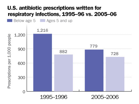 Since the mid-1990s, doctors have written fewer antibiotic prescriptions per year for respiratory infections, a new survey shows.