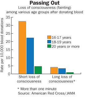In the other study, researchers at the Blood Systems Research Institute in San Francisco and United Blood Services in ScottsdaleAriz., analyzed fainting episodes arising from roughly 400,000 blood donations. They found that people age 17 and 18 years were significantly more likely to faint than donors over age 25. That report appeared online May 14 in Transfusion.