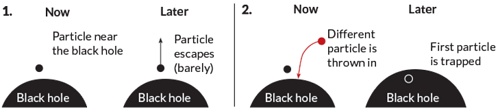 Imagine a black hole with a particle nearby, in danger of falling in (1). Sometime later, that particle may escape. But if another particle is tossed in (2), the black hole will expand, preventing the original particle from getting away. Making a minor change to the black hole changes the outcome — an indicator of chaos.