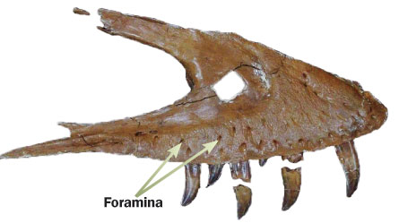 During the study, the researchers dissected modern animals with different types and amounts of facial tissue and then counted foramina. Most creatures that had a toothy smile with exposed teeth and little if any soft tissue around the mouth, such as crocodiles and their relatives, had more than a hundred small foramina on each bone around the jawline. For those with beaks made of nonpliable material, such as birds, turtles and tortoises, average foramina counts on each facial bone ranged from 50 to 100.