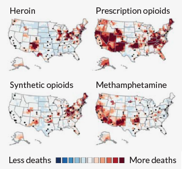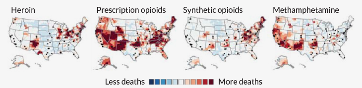 The researchers also identified geographical hot spots in drug overdose deaths in the country over time. For example, heroin-related deaths used to be associated with large cities but have now spread more widely, notably in the Southwest and Northeast. Methamphetamine-related deaths are clustered in the Southwest and up the West Coast, the researchers found, while hot spots for prescription opioid deaths cover large swaths of the country.