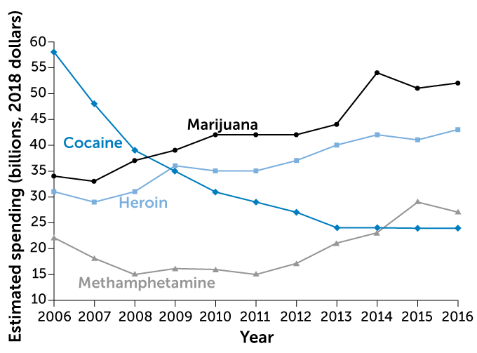 Now, an analysis released August 20 by the Rand Corporation estimates that people in the United States spent between $121 billion and $146 billion dollars annually on cocaine, heroin, marijuana and methamphetamine from 2006 and 2016. The analysis puts the drugs’ combined total on the same order as Americans’ annual alcohol tab, based on market research on the alcohol industry.