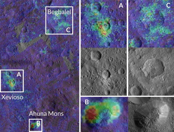 Data taken by the Dawn spacecraft show that Ceres’ surface is covered in carbonate minerals that formed with water. Blue and magenta show widespread magnesium and calcium carbonates, while green and red show hydrated sodium carbonates. The hydrated carbonates are found in craters and on mounds, suggesting briny water or slush is reaching the surface in those zones.