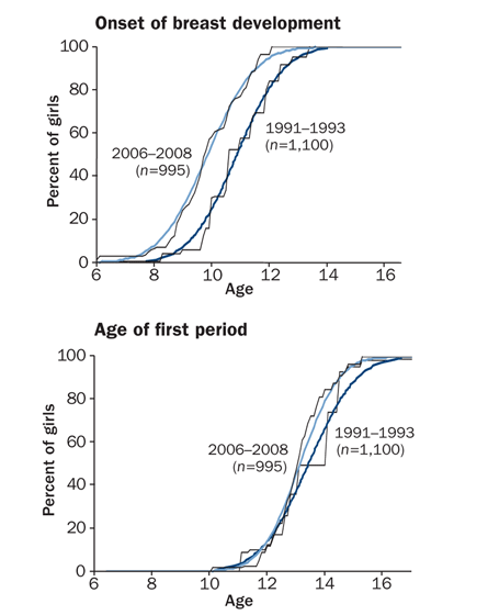 Soon after, Biro and colleagues gathered data on a cross section of American girls for a research project into possible environmental contributors to the onset of puberty. The new findings, published in 2010 in Pediatrics, support the idea that girls are developing breasts earlier, with results that vary widely by race.