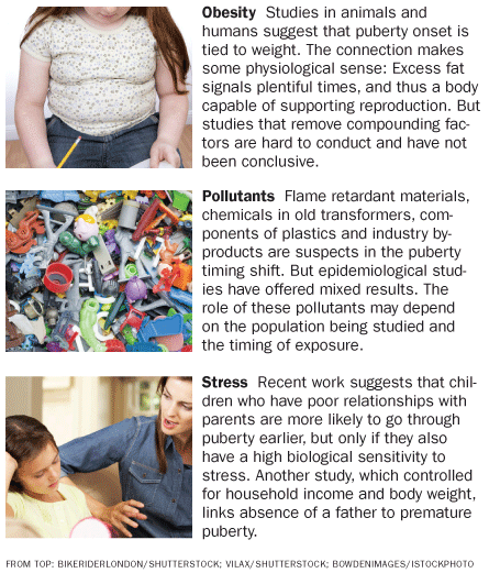 Scientists now agree that the age of onset of puberty is shifting, at least among girls. But the culprit behind that shift is not yet known. Recent studies point to a number of possible contributors that could be acting on their own, together or with unexplored factors to explain the trend.