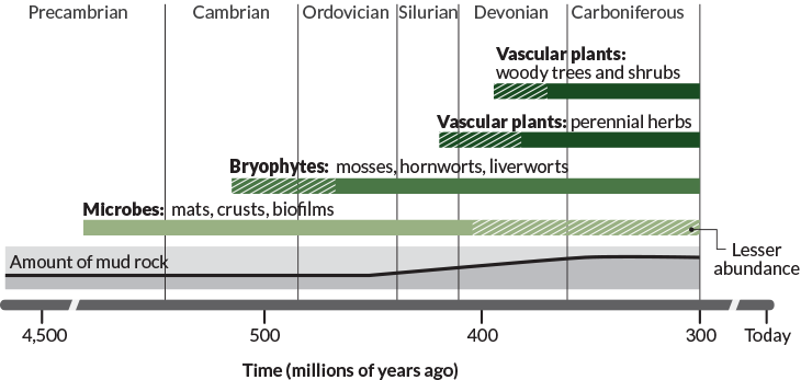 Plants’ evolution and colonization of Earth altered its landscape. The appearance of the earliest land plants coincided with a rise in mud rock starting around 458 million years ago.