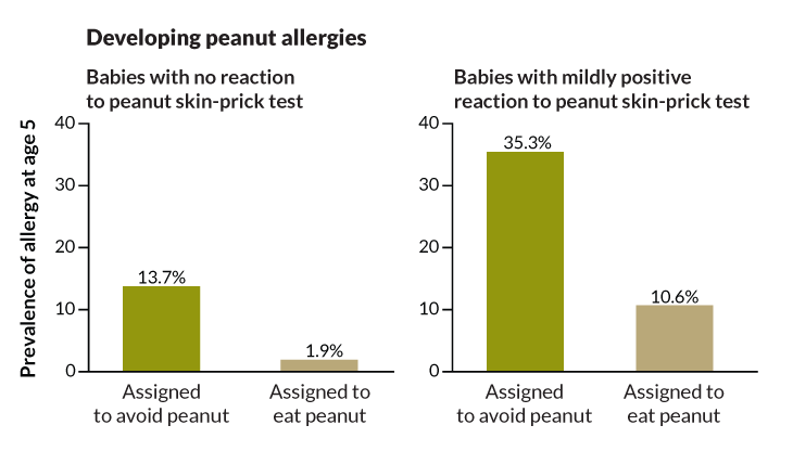 Among 530 babies who had no reaction to the peanut skin test at the outset, the peanut allergy rate at age 5 was 13.7 percent in the avoidance group and 1.9 percent in the peanut butter group. Among 98 other babies who had a slight or modest reaction to the skin-prick test, 35.3 percent of those assigned to avoidance were allergic by age 5. Only 10.6 percent of the 5-year-olds eating peanut butter were allergic. The report also appears online February 23 in the New England Journal of Medicine.