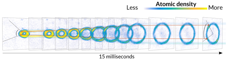 To mimic the physics of inflation in the early universe, scientists rapidly expanded a ring-shaped Bose-Einstein condensate, which decreased in density as it expanded over 15 milliseconds.