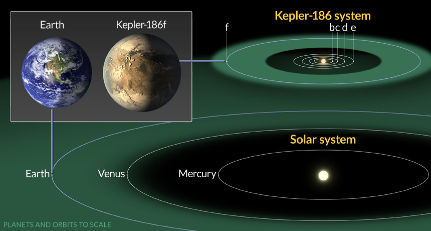 Elisa Quintana, an astronomer at the NASA Ames Research Center in Moffett Field, Calif., and colleagues discovered the planet, Kepler-186f, in data from the first three years of Kepler’s mission. The planet is 10 percent larger than Earth and orbits a type of star called an M dwarf, a red star that is smaller, cooler and fainter than the sun. The planet circles the star Kepler-186 once every 130 days in an orbit slightly smaller than Mercury’s. The star, which is 490 light-years away in the Cygnus constellation, also hosts four other roughly Earth-sized planets. Previously discovered by Kepler, the other planets are much closer to the star, whipping around in as little as 3.9 days. Each of the planets was found using the tiny dips in starlight it creates when it passes in front of, or transits, Kepler-186.
