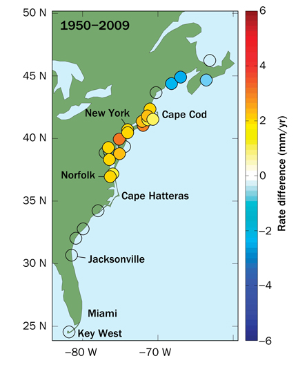“We have direct evidence of a hot spot stretching from Cape Hatteras in North Carolina to just above Boston,” says Asbury Sallenger Jr., an oceanographer at the U.S. Geological Survey’s St. Petersburg Coastal and Marine Science Center in Florida. “The area has an unusual sea level rise acceleration compared to the rest of the United States.”