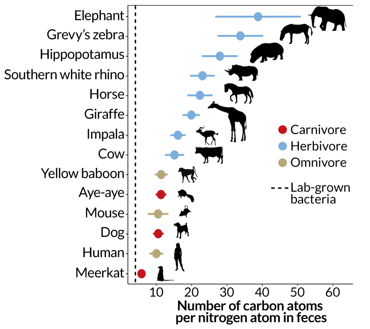 A study of feces from 30 mammal species (14 shown) suggests that gut microbes have a limited supply of nitrogen. Gut bacteria grown in lab dishes (dotted line) incorporated about four atoms of carbon for every nitrogen, but the feces contained more carbon for each nitrogen. Herbivores had the highest carbon levels and the lowest nitrogen levels. Carbon was also the major nutrient in the feces of carnivores and omnivores, but meat eaters had more nitrogen, which is found in protein, than those animals that ate mostly plants.