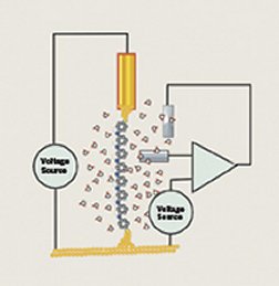 To study the electronic behavior of individual molecular strands within that forest, the researchers used an extremely fine gold probe to briefly catch an individual oligoaniline strand and monitor its voltage and current. Simultaneously, the researchers adjusted the voltage on the electrode to simultaneously flip all the oligoaniline molecules between electrically conducting and insulating states.