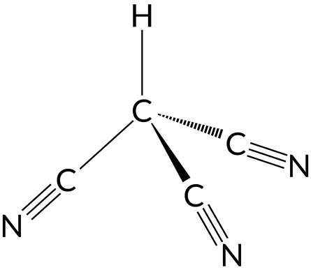 The acid has a central carbon atom attached to a hydrogen atom as well as to three cyano groups, each consisting of a carbon triple-bonded to a nitrogen. The molecule loses its hydrogen atom very easily, making it a strong acid and demonstrating a fundamental rule of carbon acids. The rule describes how electron-loving groups (in this case, the cyano groups) attached to a central hydrogen-toting carbon pull on that carbon’s electrons. The molecule’s electrons settle into a cozy position close to the cyano groups, leaving the link to the hydrogen extremely weak.