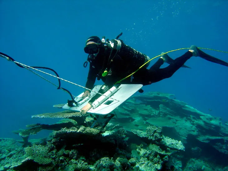To track turtles and other reef-dwelling organisms, researchers were attached by a line to slow-moving boats that dragged them — in pairs — across stretches of coral reefs. “It’s a spectacular way to see the reef system, one hour at a time,” Brainard says. He saw turtles young and old, curious and shy. “They’re just so graceful,” Brainard says. “We’d see them sort of gliding along or sleeping in the caves and overhangs of the reefs.”