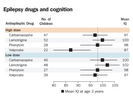 Children whose mothers had taken valproate while pregnant had IQs that were substantially lower on average than did children exposed to other antiepileptic drugs in utero. While the average IQ for the general population is 100, 3-year-olds whose mothers took valproate had an average IQ of 92. That is 9 points lower than those exposed to lamotrigine (Lamictal), 7 points lower than phenytoin (Phenytek or Dilantin) and 6 points lower than carbamazepine (Tegretol).