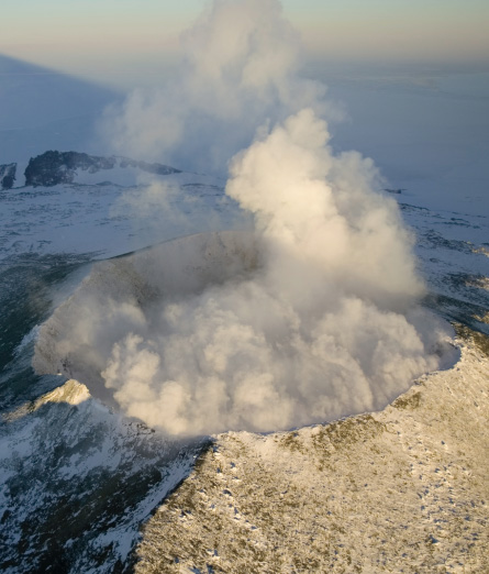 The CO2 measured by Oppenheimer and colleagues in belched gases indicates that Erebus is pumping carbon from more than 16 kilometers down, well within the mantle. Such deeply derived CO2 will extract water from the molten rock. “This drying out is one way that magmas evolve,” Oppenheimer explains.