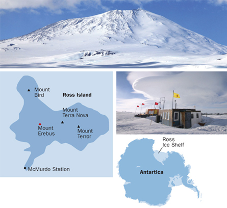 MCMURDO STATION, ANTARCTICA — Even when the December sun beats down 24 hours a day, most of Antarctica remains cold, if not brutally frigid. With one dramatic exception. Wind-blown clouds of steam rise year-round from a lava lake atop Mount Erebus, the planet’s southernmost active volcano.
