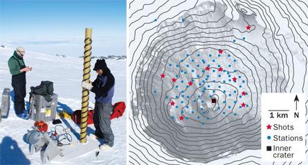 Daria Zandomeneghi, now a fellow at the Abdus Salam International Centre for Theoretical Physics in Trieste, Italy, led a related Erebus mapping project while working with Kyle at New Mexico Tech. Her team planted explosive charges in 20-centimeter diameter ice holes at depths of 7 to 15 meters. A network of portable seismic sensors then recorded the shock waves generated by a sequence of 12 detonations.