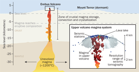 Earthquakes have sometimes accompanied the volcano’s more dramatic eruptive events, particularly in the late 1980s. So a year-round seismic monitoring system listens for signs of rattling on or below the volcano. Some Erebus watchers have begun using that technology to map the volcano’s interior.