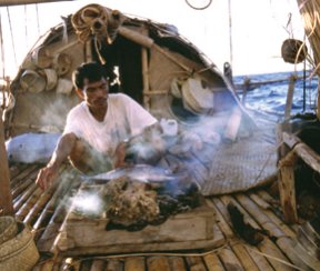 That experience resulted in Nale Tasih 2, a 58-foot-long, 2.8-ton bamboo raft rigged with a single palm-leaf sail. In December 1998, a crew guided this vessel from Timor to Australia, taking 13 days to travel nearly 600 miles. Two hollow mangrove tree trunks held fresh water for the travelers. Meals consisted of fish caught with bone harpoons and cooked over a small hearth, as well as rations of palm sugar and fruit.